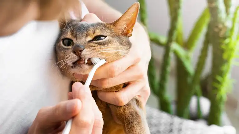 Different animals will require different dental cleaning tools. You can use a special brush or cotton swab to clean a cat's teeth, but should only use a dog toothbrush on canines with pet-friendly toothpaste. Ask your vet to recommend toys that can help clean your dog's teeth naturally. You should take your pet for professional teeth cleanings every one to two years, depending on the breed and their oral health. Smaller animals, like rodents, may not require teeth brushing at all, but can maintain good oral health via chew toys available and eating a healthy diet.